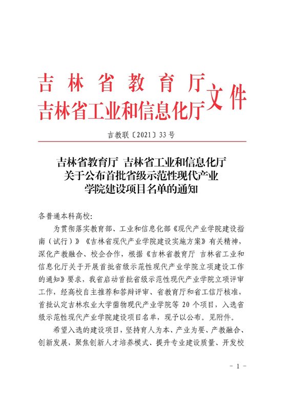 (新闻网讯 教务处报道)为贯彻落实教育部、工业和信息化部《现代产业学院建设指南(试行)》《吉林省现代产业学院建设实施方案》有关精神,深化产教融合、校企合作,根据《吉林省教育厅吉林省工业和信息化厅关于开展首批省级示范性现代产业学院立项建设工作的通知》要求,我省启动首批省级示范性现代产业学院立项评审工作,经高校自主推荐和答辩评审、省教育厅和省工信厅核准,首批认定吉林农业大学菌物现代产业学院等20个项目,我校的医药健康产业学院入选省级示范性现代产业学院建设项目名单。