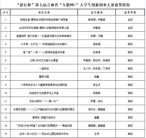 “建行杯”第七届吉林省“互联网+”大学生创新创业大赛以“我敢闯 我会创”为主题,我校学生参加了高教主赛道、“青年红色筑梦之旅”赛道和职教赛道3个赛道的角逐。总决赛采取线上路演形式进行,顾地周、尹春丽指导的《四海生香——寒带经济型农作物全球推广领导者》和尹春丽老师指导的《“山丹丹”花开红艳艳——通师人的电商扶贫传承之路》2个项目获金奖;宋娟指导的《高遗绝学 丽久弥新——打造高句丽文化传承新模式》等4个项目获银奖;李沚沭指导的《笨笨成长记》儿童素质教育系列动漫等9个项目获铜奖。