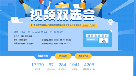 本次招聘会共邀请67家教育类单位,其中吉林省内单位38家,省外单位29家。提供职位284个,招聘需求人数4205人。来自全国116所高校的1941名毕业生参与了本场招聘会(校内1673人,校外268人),双选会当天信息浏览量达17270次,投递简历1046份,截至来稿共有213名毕业生达成了就业意向。