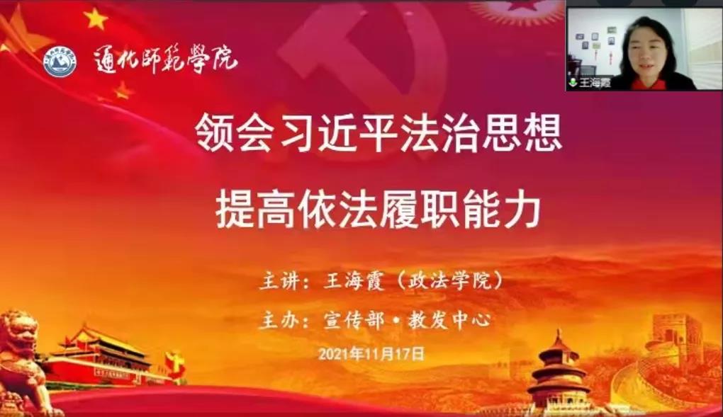 宣传部与教师教学发展中心联合举办“习近平法治思想”专题培训,政法学院王海霞副教授以“领会习近平法治思想 提高依法履职能力”为题,从习近平法治思想的的基本精神、核心要义和实践要求三方面为教师作专题培训。