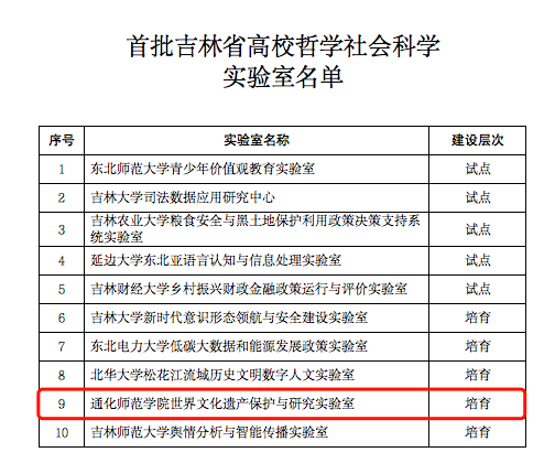 (新闻网讯 科研处报道)近日,吉林省教育厅公布了10个首批吉林省高校哲学社会科学实验室名单,我校“世界文化遗产保护与研究实验室”成功入选。“世界文化遗产保护与研究实验室”的获批实现了我校省级哲学社会科学实验室零的突破,学校将深入推进交叉学科研究,努力建设省内一流的交叉创新平台。