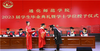 与会校领导为毕业生代表颁发毕业证书、荣誉证书。党委副书记、校长朱俊义为获得学士学位的毕业生代表颁授学位证书,扶正流苏。